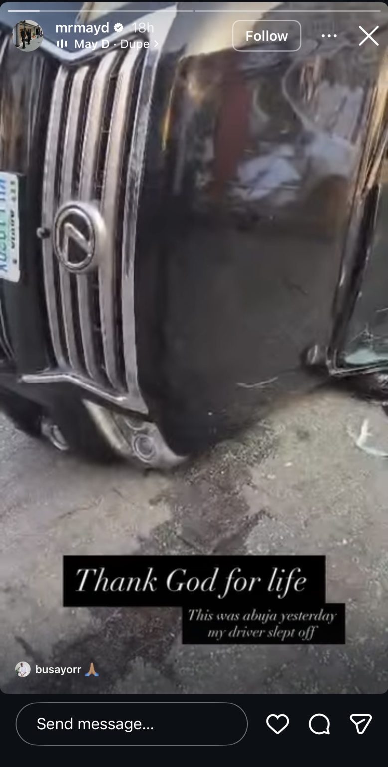 “My driver slept off. Thank God for life. This was Abuja yesterday,” May D wrote alongside the photos.