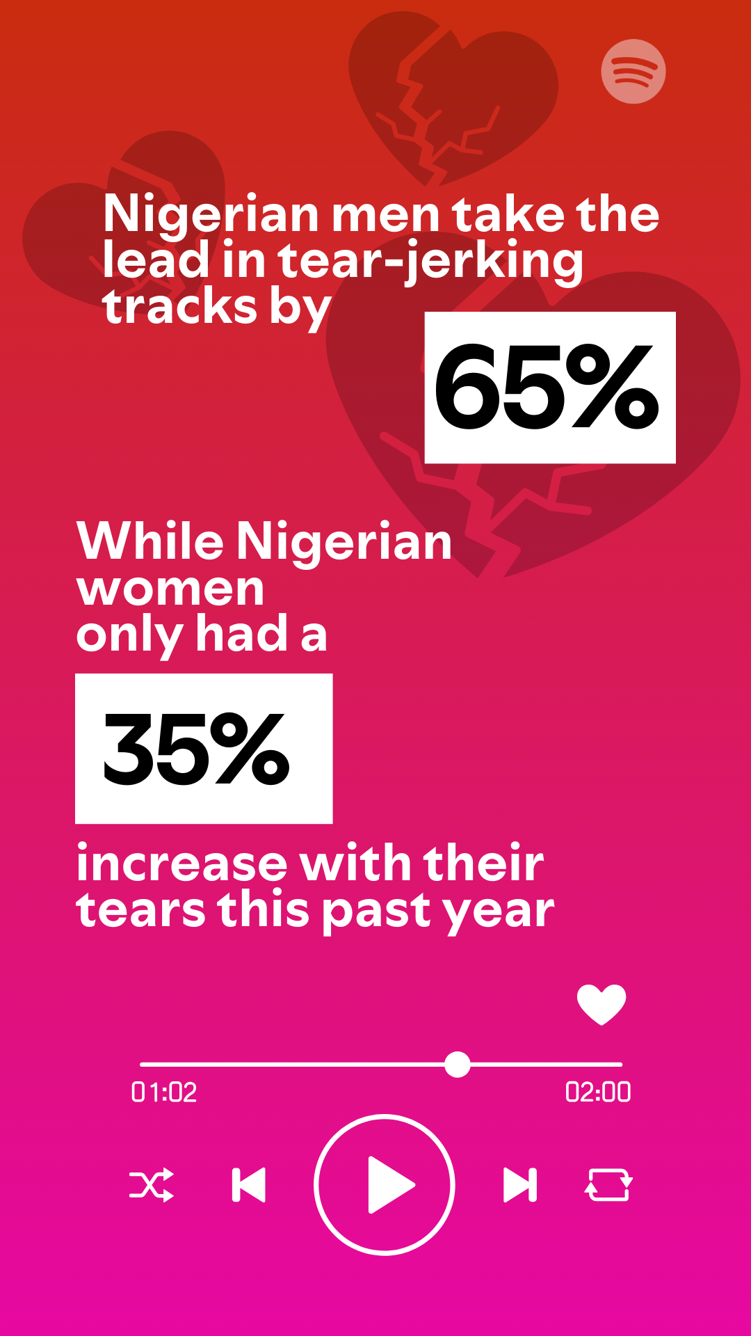 The pattern is visible across gender too. Men accounted for over 65% in heartbreak and 61% in love song streaming, while women represented just over a third in both cases, showing that both groups are actively engaging the full emotional spectrum on the day.